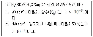 다음은 25℃에서 산 HA의 이온화 반응식과 이온화 상수를 나타낸 것이다.