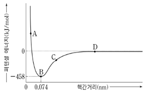 다음은 수소 원자 두 개의 핵간거리를 퍼텐셜 에너지 함수로 나타낸 그림이다. 수소 분자의 화학결합이 형성되는 최적의 지점으로 옳은 것은?