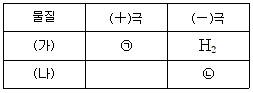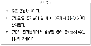 다음은 물질의 전기분해 실험 내용을 나타낸 것이다. (가)와 (나)는 각각 ZnCl2(aq), NaCl(aq) 중 하나이고, ㉠과 ㉡은 각각 Zn(s), H2(g) 중 하나이다.