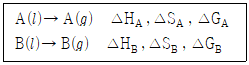 다음은 1atm에서 물질 A와 B가 기화하는 반응에 대한 열화학 반응식, 엔트로피 변화(△S), 깁스 자유 에너지 변화(△G)를 나타낸 것이다.