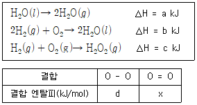 다음은 25℃, 1atm에서 3가지 열화학 반응식과, 이와 관련된 2가지 결합 엔탈피에 대한 자료이다.
