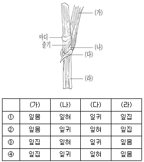 다음 그림은 보리 잎의 구성이다. (가)~(라)의 명칭을 바르게 연결한 것은?