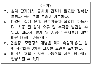 <보기>에서 건설정보모델링(BIM: Building Information Modeling)의 특징으로 옳은 항목을 모두 고른 것은?