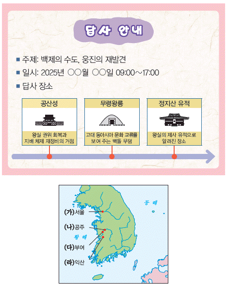 다음 답사가 이루어진 지역을 지도에서 옳게 고른 것은? [2점]