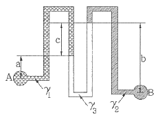그림과 같이 비중량이 γ1, γ2, γ3인 세 가지의 유체로 채워진 마노미터에서 A 위치와 B 위치의 압력 차이(PB - PA) 는?