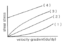 전단응력(shear stress)과 속도구배와의 관계를 나타낸 다음 그림에서 빙햄플라스틱유체(Bingham plastic fluid)를 나타낸 것은?