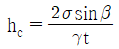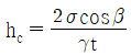 간격이 좁은 2개의 연직 평판을 물속에 세웠을 때 모세관현상의 관계식으로 맞는 것은? (단, 두 개의 연직 평판의 간격 : t, 표면장력 : σ, 접촉각 : β, 물의 비중량 : γ, 액면의 상승높이 : hc 이다.)