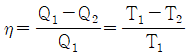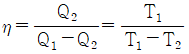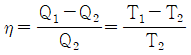 카르노 사이클에서 열효율과 열량, 온도와의 관계가 옳은 것은? (단, Q1>Q2, T1>T2)