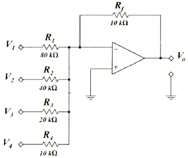 다음 회로의 출력전압 VO 는 몇 V인가? (단, V1=8V , V2=0V , V3=0V , V4=8V)