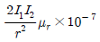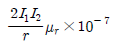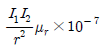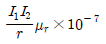 두 개의 무한히 긴 직선도체를 거리 r(m)간격으로 평행하게 놓고, 각각에 I1, I2의 전류를 흘렸을 때 단위 길이당 작용하는 힘(N/m)은 어떻게 표현되는가?