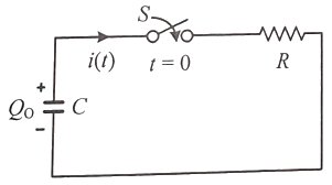 다음 회로에서 스위치(S)를 닫았을 때, t초 후에 대한 설명으로 틀린 것은? (단, Qo는 C에 충전되어 있던 전하량이다.)