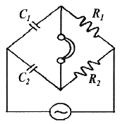 다음 브리지에서 평형 되었을 때 C1은 몇 ㎌인가? (단, R1=200Ω, R2=100Ω, C2=1㎌ 이다.)