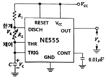 NE555 타이머의 출력주파수는 얼마인가?(단, R1=1kΩ, R2=4.7kΩ, C=0.022μF 이다.)