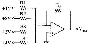 연산증폭기의 응용회로에서 출력전압은 몇 V인가? (단, R1=R2=R3=R4=50kΩ, Rf=25kΩ이다.)