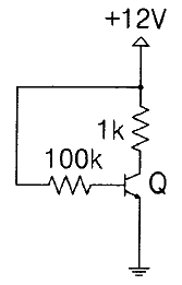다음 베이스 바이어스 회로가 25℃에서 βdc가 50이라면 VCE의 전압은 몇 V 인가? (단, 실리콘 트랜지스터를 사용한 순방향 전압강하는 0.7V로 가정한다.)