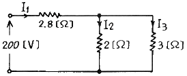 다음 회로에 200V의 전압을 가할 때 저항 2Ω에 흐르는 전류는 몇 A 인가?