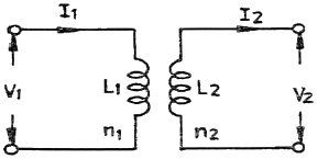 그림과 같은 이상 변압기에서 1차 전압 V1=100V일 때, 2차 전압 V2=12V가 되도록 1차 코일 수를 n1=200회로 하였다. 2차 코일의 수 n2는?