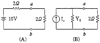 그림 (B)는 그림 (A)를 노턴의 등가회로로 나타낸 것이다. Is[A]와 Vab[V]를 올바르게 나타낸 것은?