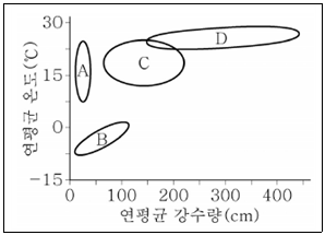 <보기>의 기후 모식도를 참고하여 생물군계를 설명한 것으로 가장 옳지 않은 것은? (단, 지역 간 이입과 이출은 없다고 가정한다.)