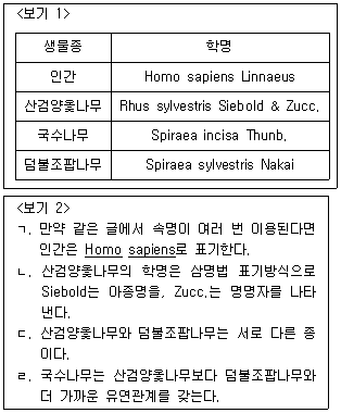 <보기 1>은 몇몇 생물종의 학명을 나타낸 것이다. <보기 2> 학명에 대한 설명 중 옳은 것을 모두 고른 것은?