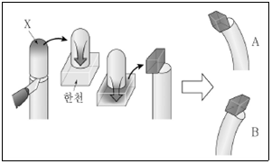 <보기>와 같이 자엽초를 이용해 식물의 특정 호르몬을 확인하는 실험을 수행하였다. 실험 결과에 대한 설명으로 가장 옳은 것은? (단, 실험은 빛이 차단된 암소에서 진행되었다.)