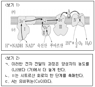 <보기 1>은 미토콘드리아 내막에 있는 전자전달계의 모식도이다. <보기 2>의 설명 중 옳은 것을 모두 고른 것은?