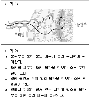 <보기 1>은 나무의 뿌리에서 물이 흡수되어 물관까지 도달하는 경로를 나타낸 것이다. 식물체에서 물의 이동이 증산작용에 의해서만 시작된다고 가정할 때, <보기 2>의 설명 중 옳은 것을 모두 고른 것은?