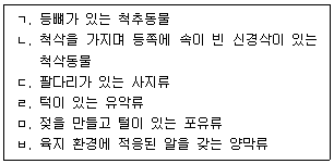 동물의 계통 분류는 분자생물학적 특징과 형태적 자료에 의하여 구분할 수 있다. 진화과정에서 <보기>의 계통수 설명을 상위계통에서 하위계통의 순서대로 바르게 나열한 것은?