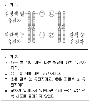 <보기 1>은 일반적인 세포 분열 중인 어떤 동물의 체세포에서 교차가 일어나기 전 상태에 있는 한 쌍의 상동 염색체를 나타낸 것이다. 이에 대한 <보기 2>의 설명 중 옳은 것을 모두 고른 것은?