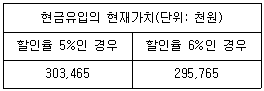 사업기간 초에 3억원을 투자하여 다음과 같은 현금유입의 현재가치가 발생하는 투자사업이 있다. 이 경우 보간법으로 산출한 내부수익률은? (단, 주어진 조건에 한함)