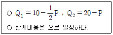 두 명의 수요자로 구성된 X재 시장에 관한 설명으로 옳은 것은? (단, P는 가격, Q1과 Q2는 각각 개인 1과 2의 수요함수)