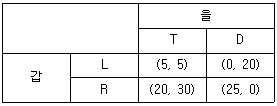 갑과 을의 동시선택게임에서 전략이 각각 L, R과 T, D일 때, 다음 설명 중 옳은 것은? (단, 괄호 안 왼쪽은 갑, 오른쪽은 을의 보수)