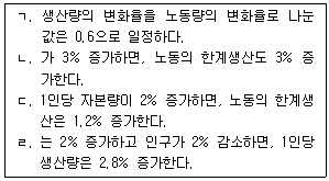 甲국의 총생산함수가 Y=AK0.4L0.6이다. 甲국 경제에 관한 설명으로 옳은 것을 모두 고른 것은? (단, Y는 생산량, A는 총요소생산성, K는 자본량, L은 노동량으로 인구와 같다.)