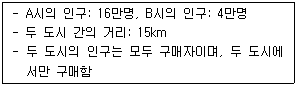컨버스(P. Converse)의 분기점모형에 따르면 상권은 거리의 제곱에 반비례하고 인구에 비례한다. 다음의 조건에서 A, B 도시의 상권 경계지점은 A시로부터 얼마나 떨어진 곳에 형성되는가? (단, 주어진 조건에 한함)