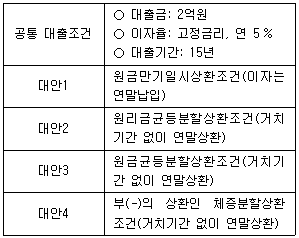 주택자금대출을 위한 다음과 같은 대안에 관한 설명으로 옳은 것은? (단, 주어진 조건에 한함)