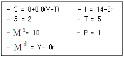 아래의 IS-LM 모형에서 균형민간저축(private saving)은? (단, C는 소비, Y는 국민소득, T는 조세, I는 투자, r은 이자율, G는 정부지출, MS는 명목화폐공급량, P는 물가수준, Md는 명목화폐수요량이다.)