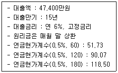A는 다음과 같은 조건을 가지는 원리금균등분할상환방식의 주택저당대출을 받았다. 5년 뒤 대출잔액은 얼마인가? (단, 주어진 자료에 한함)
