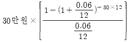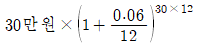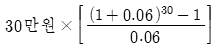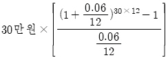 A는 향후 30년간 매월 말 30만원의 연금을 받을 예정이다. 시중 금리가 연 6% 일 때 , 이 연금의 현재가치를 구하는 식으로 옳은 것은? (단, 주어진 조건에 한함)