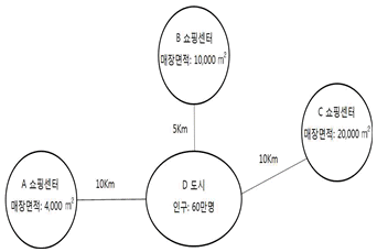 D도시 인근에 A, B, C 세 개의 쇼핑센터가 있다. 허프(Huff)의 상권분석모형을 적용할 경우, 각 쇼핑센터의 이용객 수는? (단, 거리마찰계수: 2, D도시인구의 40%가 위 쇼핑센터의 이용객이고, A, B, C 중 한 곳에서만 쇼핑함)