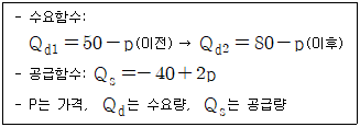 부동산정책의 시행으로 A지역 아파트시장의 공급함수는 일정하고 수요함수는 다음과 같이 변화되었다. 이 경우 y축, 수요곡선, 공급곡선으로 둘러싸인 도형의 면적과 균형거래량의 변화는? (단, 거래량과 도형 면적의 단위는 무시하며, x축은 수량, y축은 가격을 나타냄)