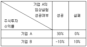 투자자 甲은 100으로 기업 A, B의 주식에만 (기업 A에 x, 기업 B에 100-x) 투자한다. 표는 기업 A의 신약 임상실험 성공여부에 따른 기업 A, B의 주식투자 수익률이다. 임상실험의 결과와 관계없이 동일한 수익을 얻을 수 있도록 하는 x는?