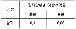 경제상황별 예상수익률이 다음과 같을 때, 상가 투자안의 변동계수(coefficient of variation)는? (단, 호황과 불황의 확률은 같음)