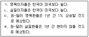 1년 간 물가상승률이 한국은 3%, 미국은 2%가 될 것으로 예상되며, 한국의 1년만기 명목이자율은 5%이다. 구매력평가설(purchasing power parity)과 이자율평가설(interest rate parity)이 성립하는 경우, 이에 관한 설명으로 옳은 것을 모두 고른 것은? (단, 원-달러 환율은 1달러 당 한국 원화 단위로 표시된다.)