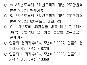 이자율과 할인율이 연 8%로 일정할 때, A, B, C를 크기 순서로 나열한 것은? (단, 주어진 자료에 한하며, 모든 현금흐름은 연말에 발생함)