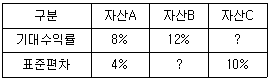 위험회피형 투자자가 평균분산지배원리를 적용하여 투자안을 검토하고 있다. 이 투자자의 효용함수는 2차 함수 형태이며, 각 자산의 수익률은 정규분포를 따른다. 각 자산의 기대수익률과 표준편차가 다음과 같을 때 옳은 것은?