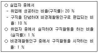 t시점의 실업률은 10%, 경제활동참가율은 50%이다. t시점과 t+1시점 사이에 아래와 같은 변화가 발생할 때, t+1시점의 실업률은? (단, 취업자와 비경제활동인구 사이의 이동은 없고, 소수점 둘째자리에서 반올림하여 소수점 첫째자리까지 구한다.)