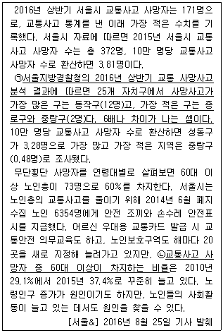 최비서는 다음 신문기사를 분석해 보고서를 작성하려고 한다. ㉠부분의 자치구별 사망사고 수와 ㉡부분의 연령별 교통사고 사망자 비율을 표현하는데 가장 적합한 그래프 형태를 바르게 연결한 것은?