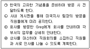 미국지사의 팀장인 Greg Crawford는 한국에 업무상 10월 30일 입국 예정이며 상사는 그 즈음에 출장으로 부재중이어서 김 비서에게 대리 접견을 요청하였다. Greg씨를 맞이하는 비서의 태도로 부적절한 것을 고른 것은?