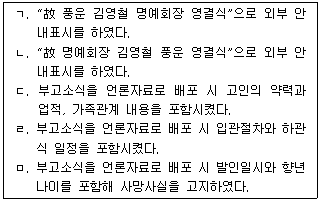 사장님의 아버지인 회사 설립주 김영철 명예회장의 호는 풍운이다. 다음 중 회사장으로 치러지는 김영철 명예회장의 장례 절차를 준비하는 비서의 업무 수행 중 적절하지 않은 것으로만 묶여진 것은?