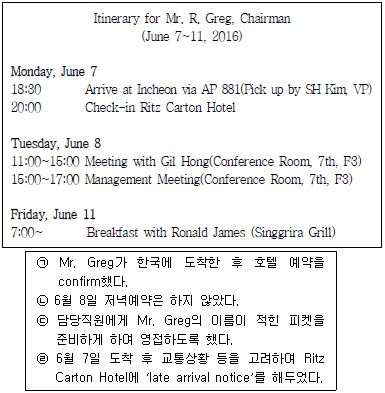 아래는 Mr. R. Greg 회장의 방한 일정표이다. 한국 방문이 처음인 본사 회장 Mr. R. Greg의 방문 일정이 원활히 진행되기 위한 김 비서의 업무수행 중 가장 옳은 것끼리 짝지은 것은?